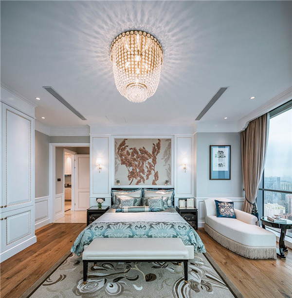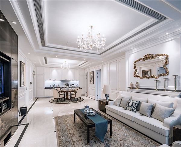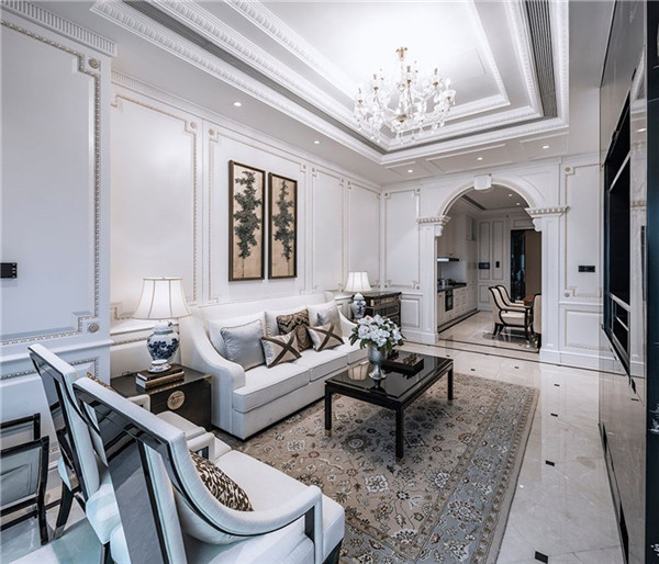 本項目公寓部分室內硬裝、軟裝設計均由港源設計團隊完成。設計師從豪華汽車、游艇、私人飛機的高品質裝潢中獲取設計靈感;設計風格采用改良的古典歐式風格,從簡單到繁雜、從整體到局部,精雕細琢,鑲花刻金都給人一絲不茍的印象,將豪華、優雅的涵義以新時代的面貌予以呈現,并保留了材質、色彩的基本風格,可以強烈地感受傳統的歷史痕跡與渾厚的文化底蘊,同時又摒棄了過于復雜的肌理和裝飾。