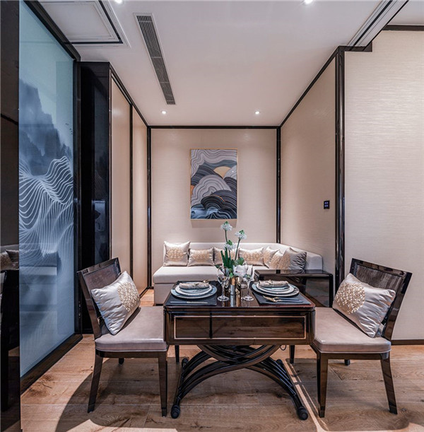 光亮的癭木黑桃木家具、屏風門、座椅及沙發布置和精致的墻框、門框,一同營造出華麗舒適的氛圍,家具和木飾面均采用了鋼琴漆面,盡顯高貴。