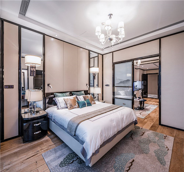 比照五星級酒店的標準,公寓里的床采用了70厘米的床高設計,床墊軟度適中,床頭軟裝采用真皮包裹,集品質感和舒適度為一體。