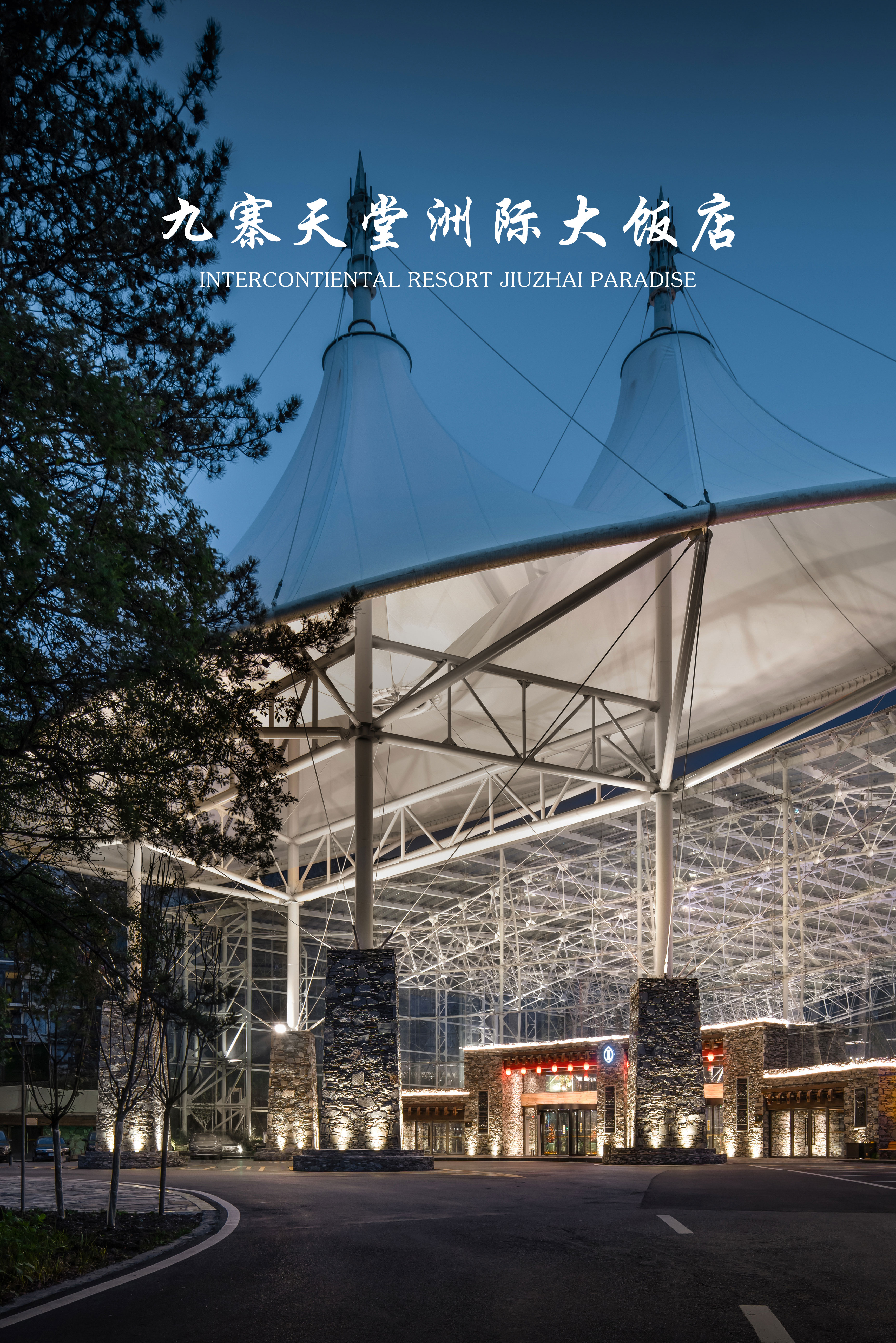 酒店于2003年開業,在當時是亞洲最大的洲際酒店,在2007年初,九寨天堂洲際大飯店又斥資四千五百萬,對其內部進行重新裝修,并在酒店大堂增設了環保地熱供暖系統。整套系統環保效益顯著、無燃燒、無排煙及廢棄物、清潔無污染,為游客提供了更為清新的空氣質量。酒店建筑面積15萬平方米,集會議、餐飲、娛樂、度假、休閑、養生、購物、住宿為一體。整個建筑背靠群山,掩映在原始森林中,集中詮釋了“消失的建筑”這一理念。