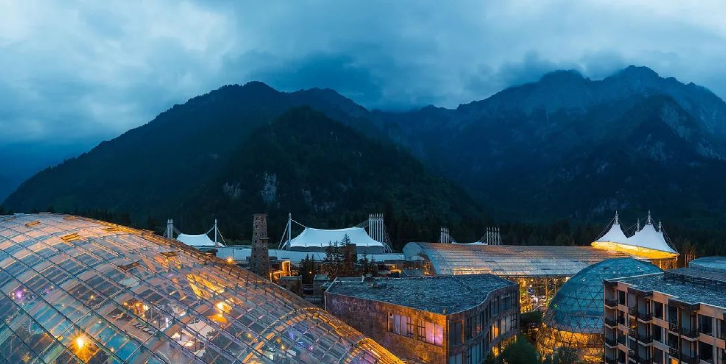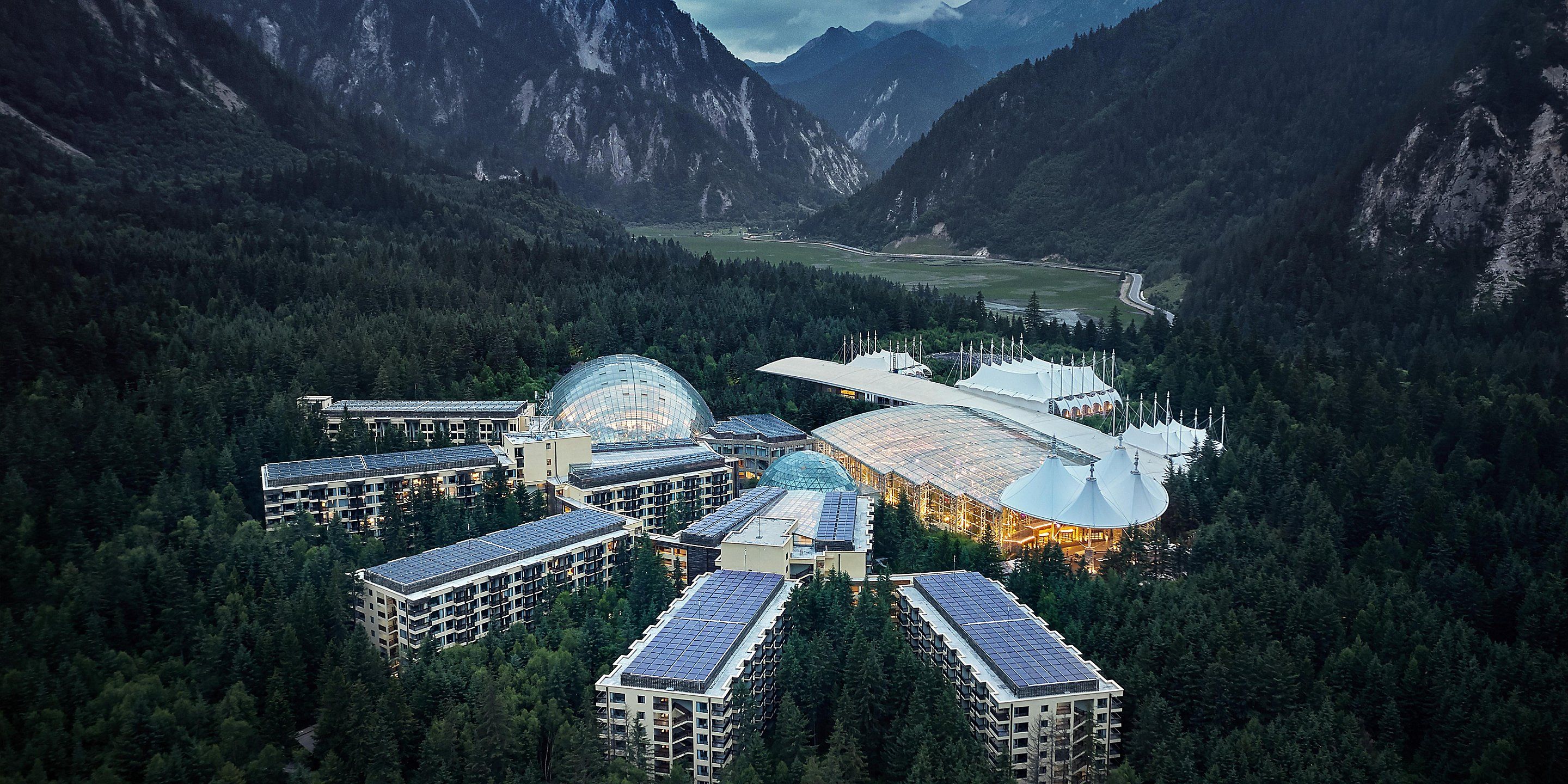 建筑群背靠雪山,掩沒于原始森林之中,以群山環繞、綠樹蔽日、碧水流淌的自然環境,配置全球一流的、前衛的建筑形式,使客人在享受高檔硬件條件的同時,通過被譽為"消失的建筑" Disappeared architecture的透明的全玻璃頂建筑,容身心于藍天白云森林綠樹之間。森林別墅依山傍水,遠瞻皚皚雪山,前眺碧海草甸,自然環境美妙絕倫。鋼拱架全透明玻璃結構的10000平方米大堂、10000多平方米的溫泉中心、會議中心及各色餐廳、酒吧、古羌寨結合在一起,像一片花瓣,飄落在森林中。(九寨天堂洲際大酒店連續兩年被評為"中國十大最受歡迎度假酒店",獲"金枕頭"獎,且通過"綠色環球21"認證的酒店)