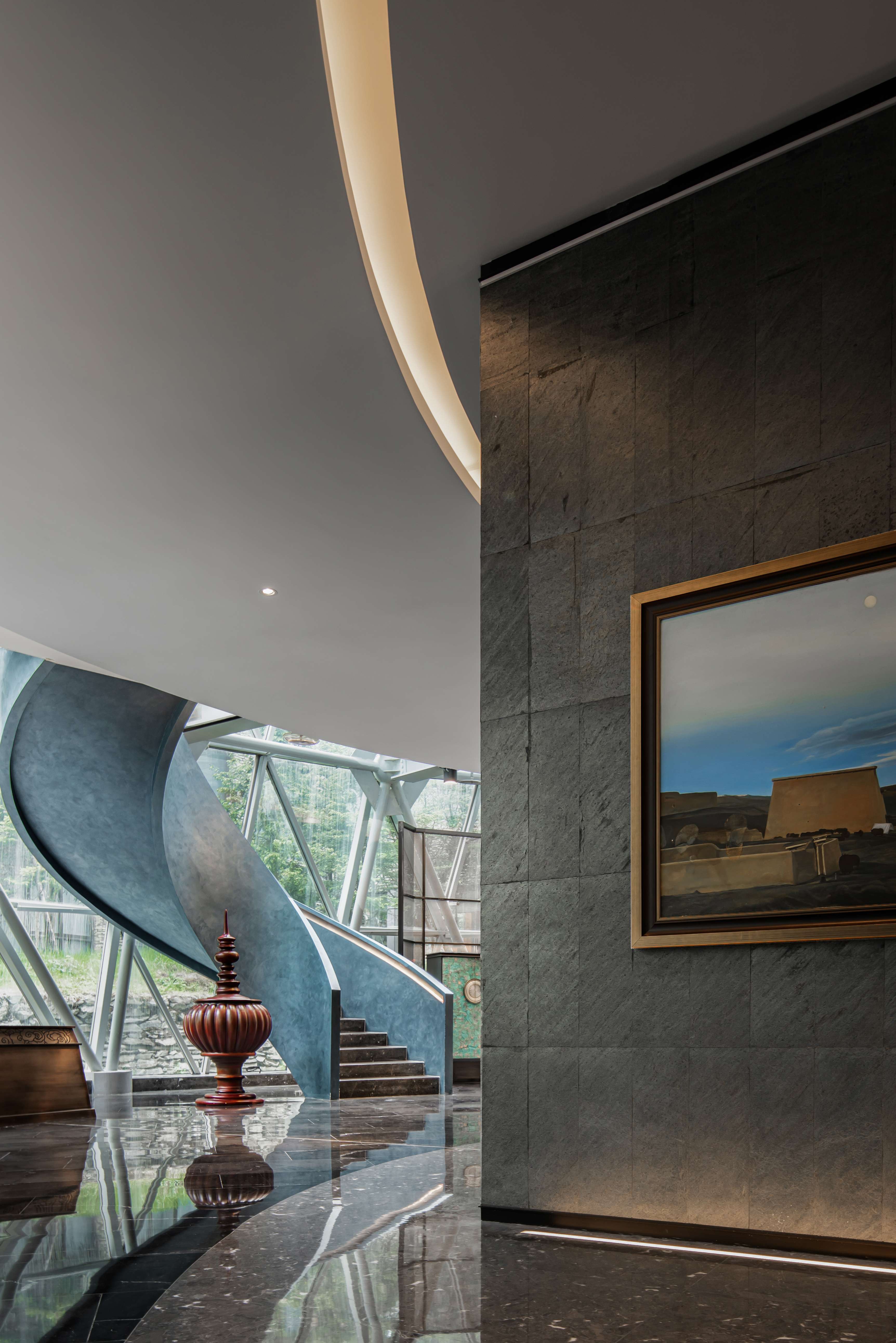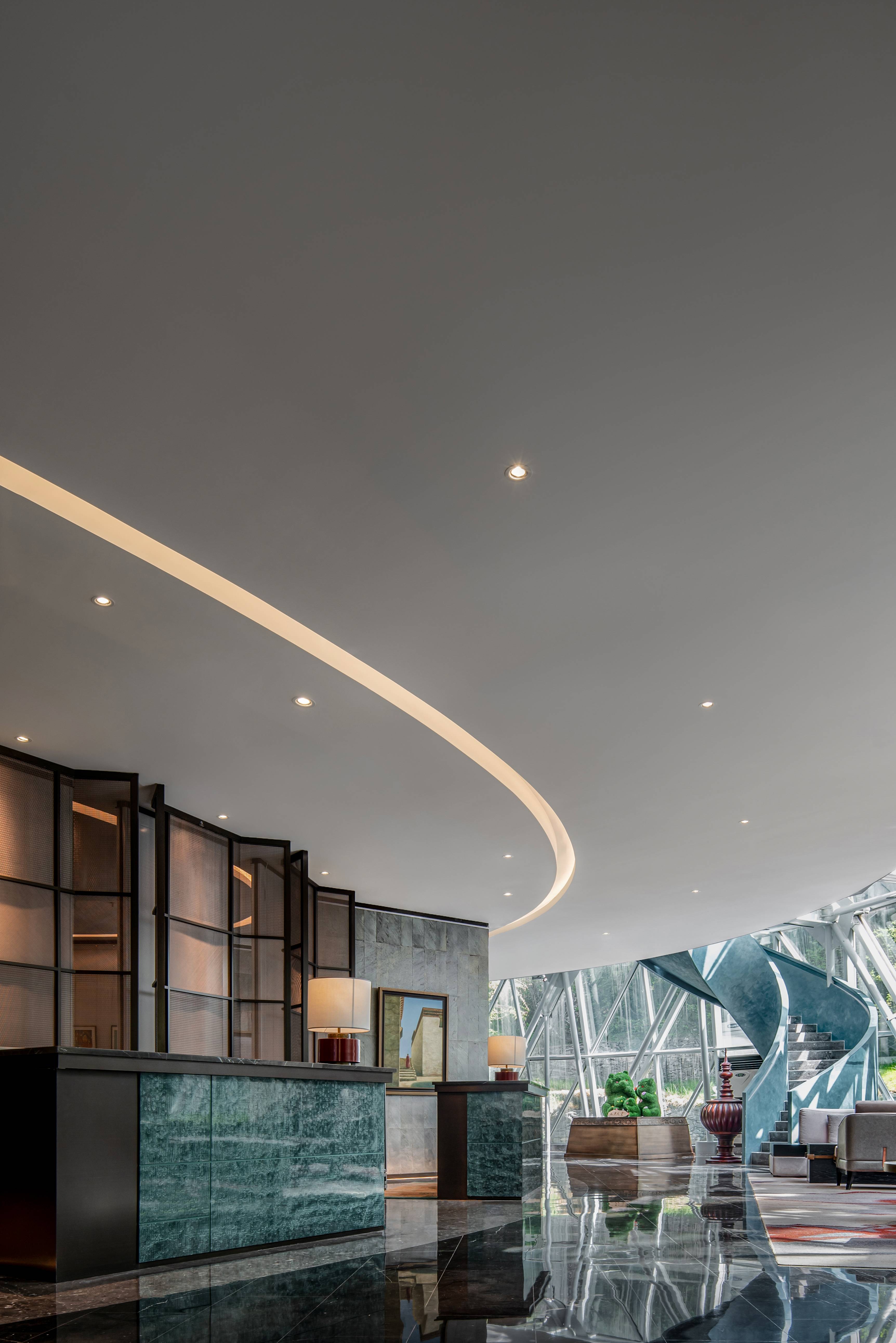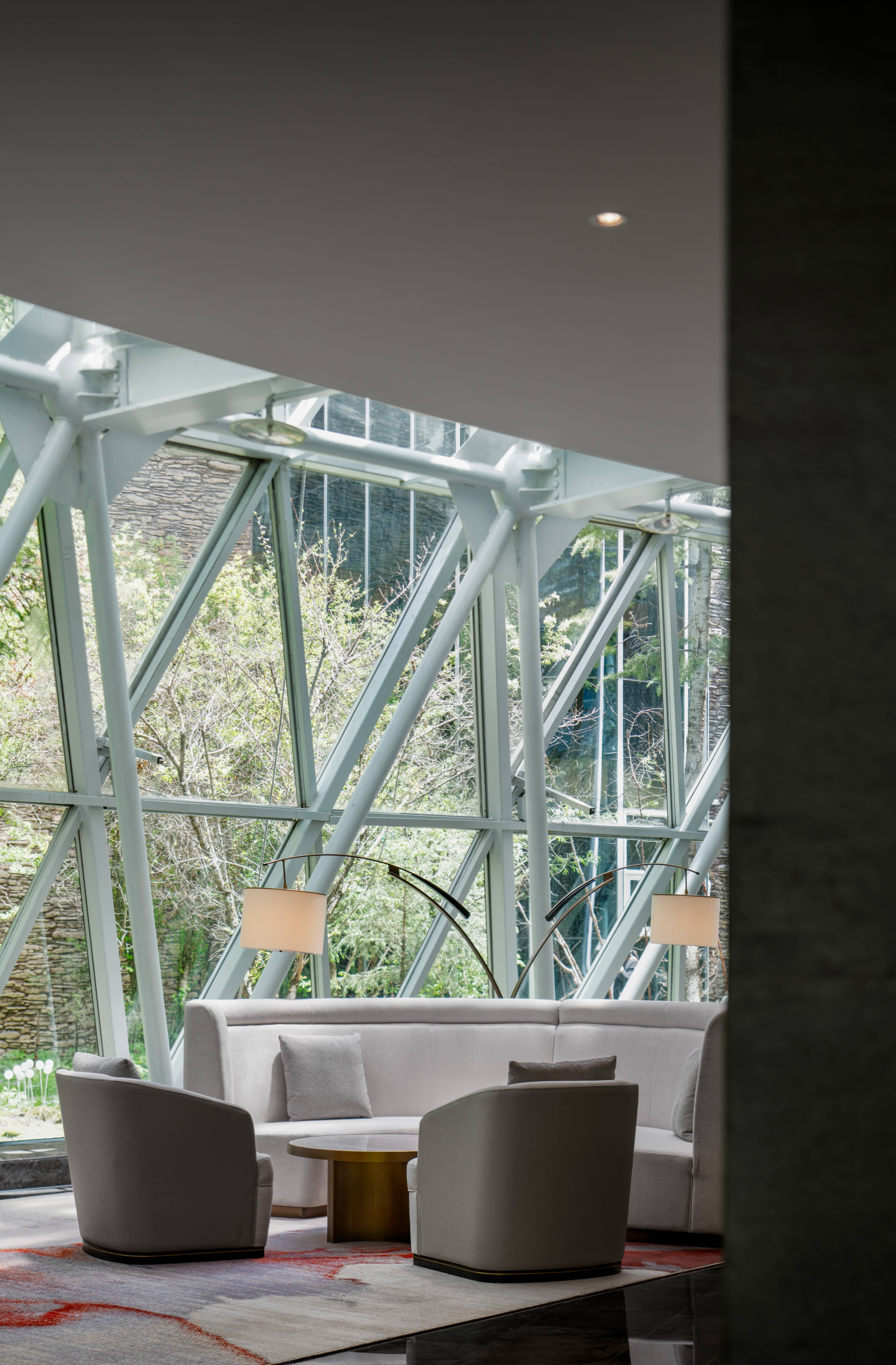 大堂休息區布置在景色最好的區域,這里被自然森林所環抱,不同的時節可感受不同的風景。