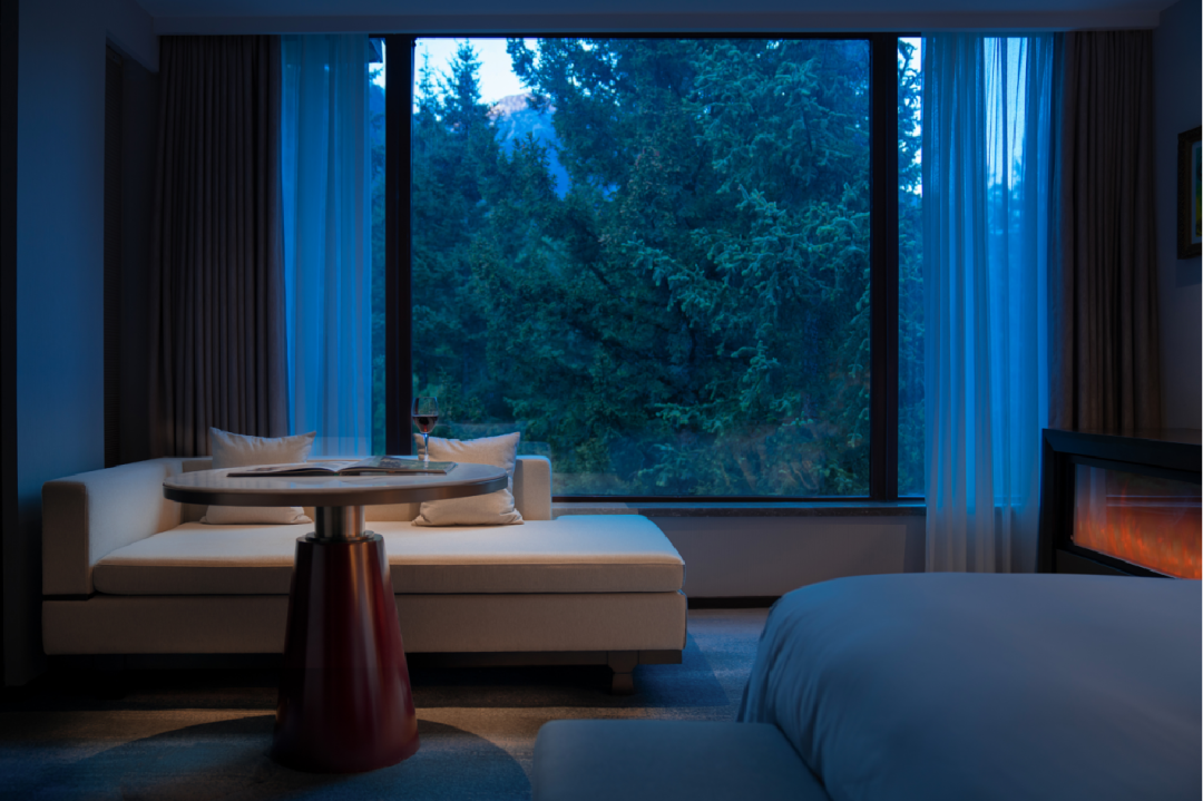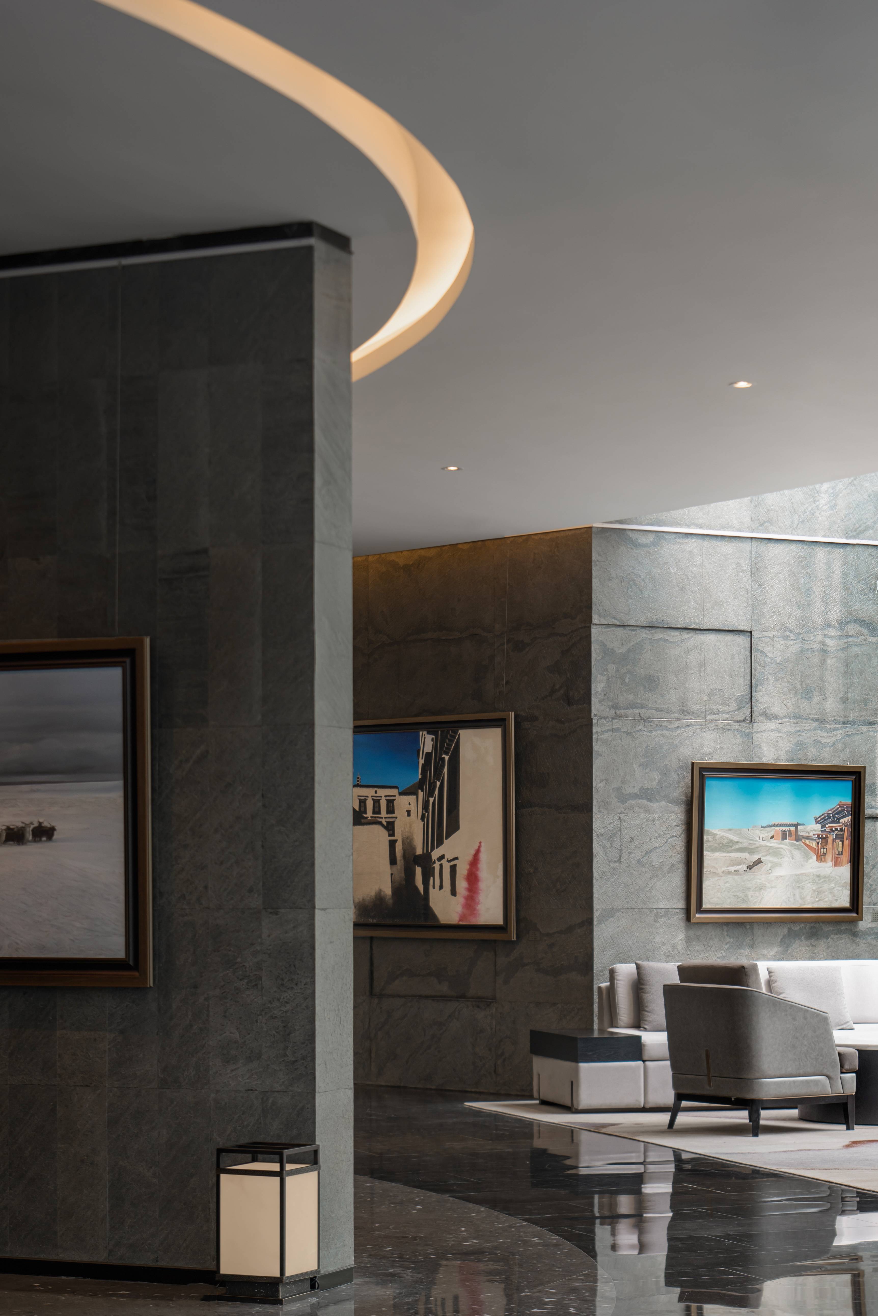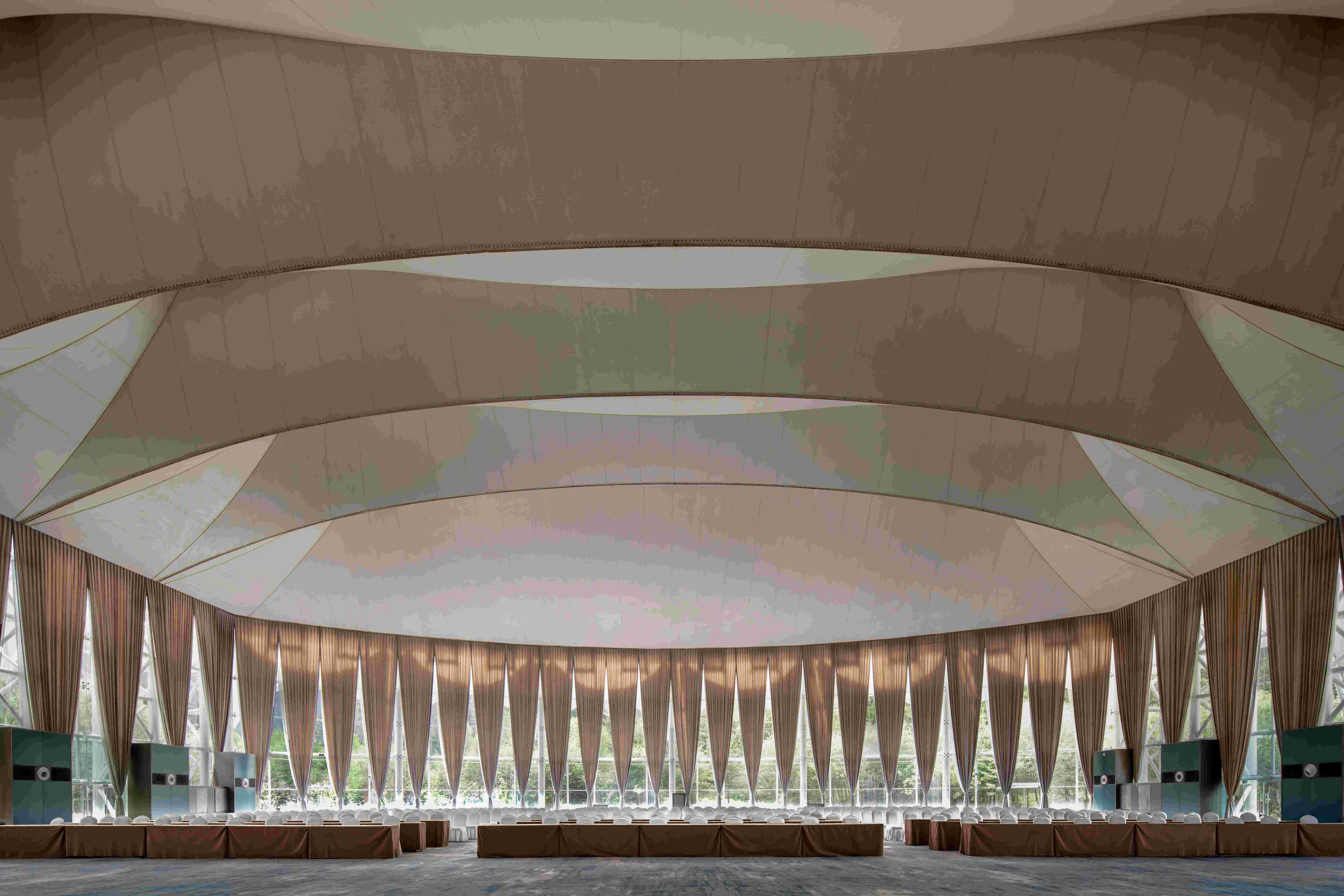 大堂休息區布置在景色最好的區域,這里被自然森林所環抱,不同的時節可感受不同的風景。