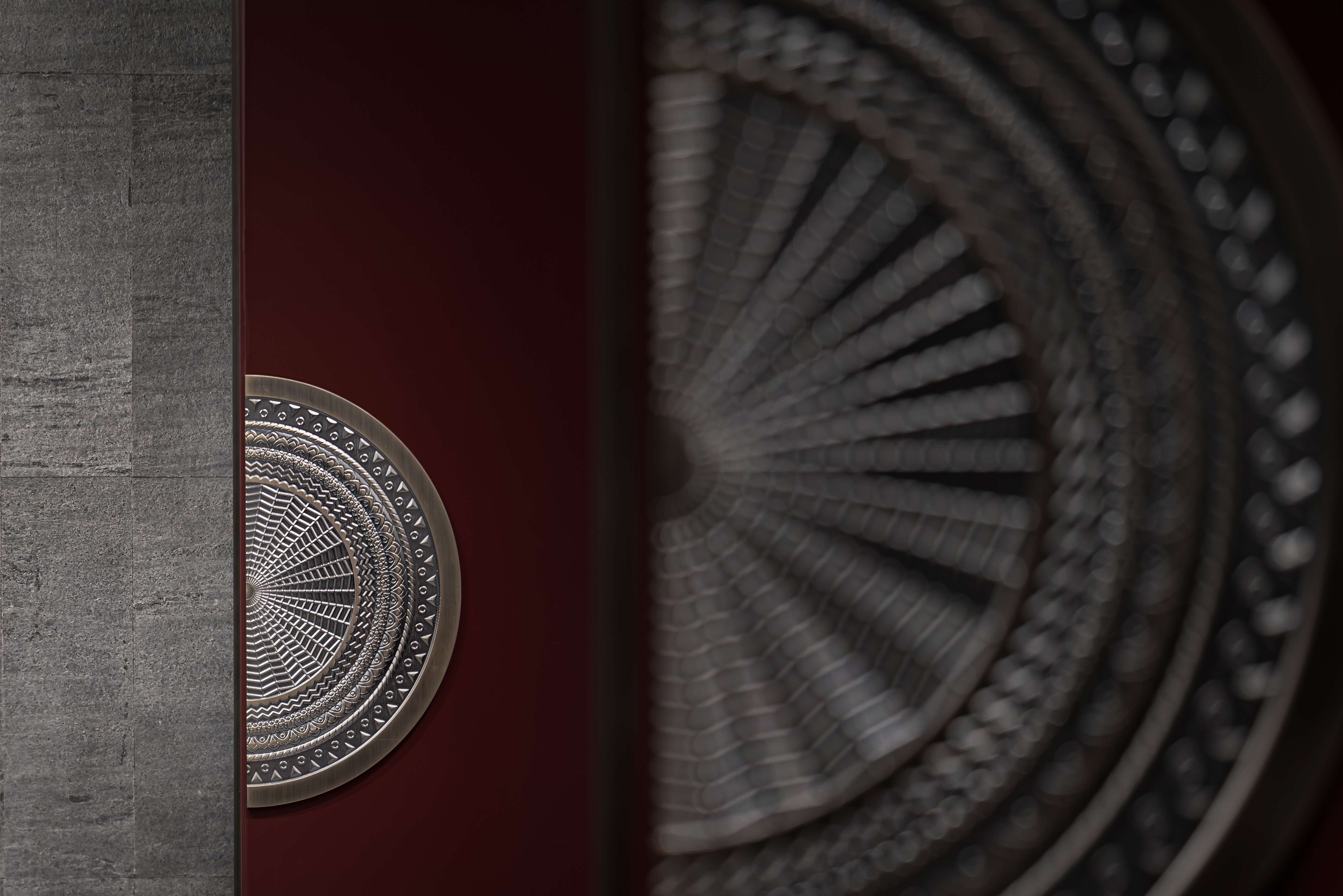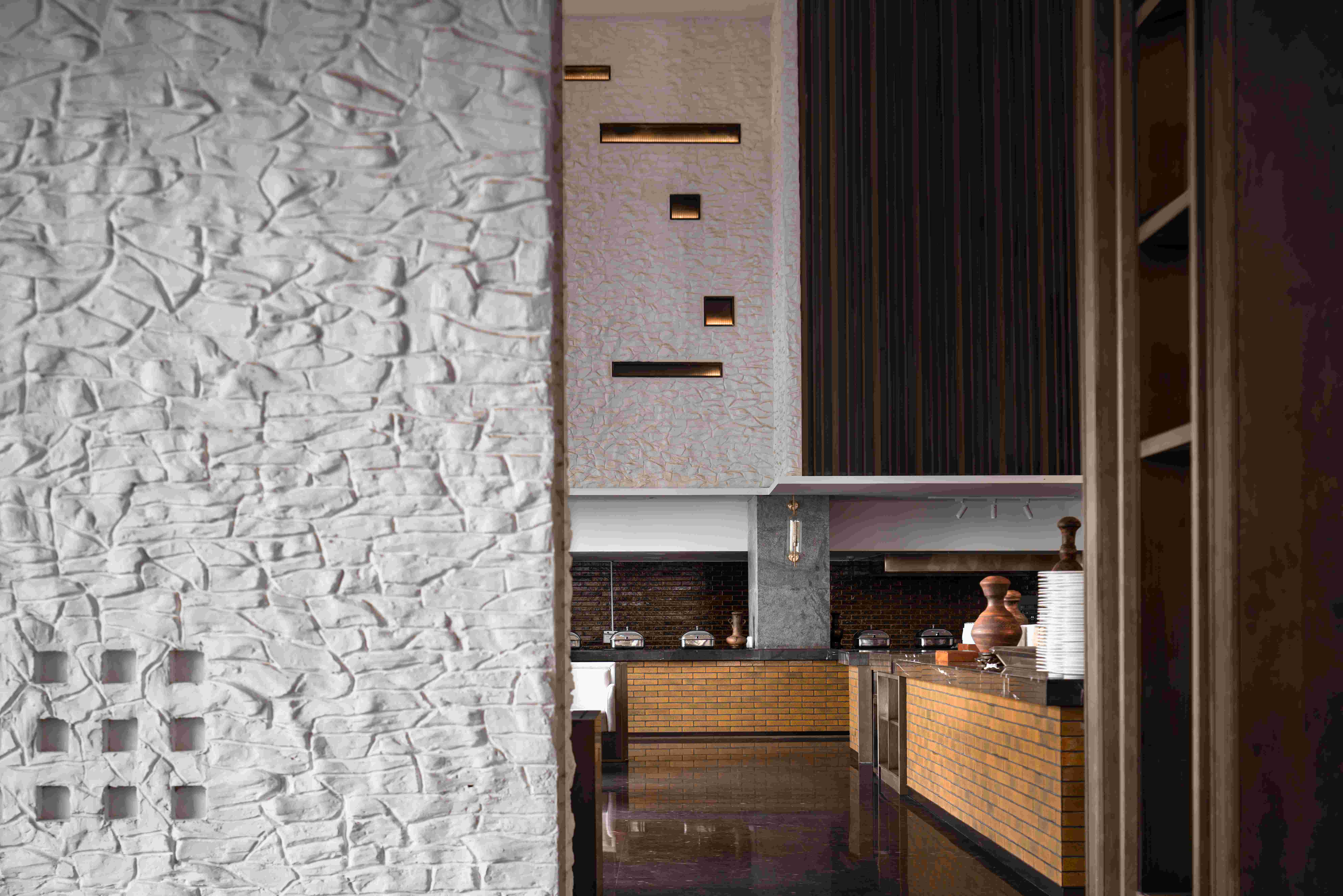 天然質感薄石材墻、藏式邊瑪墻融合藝術畫廊。