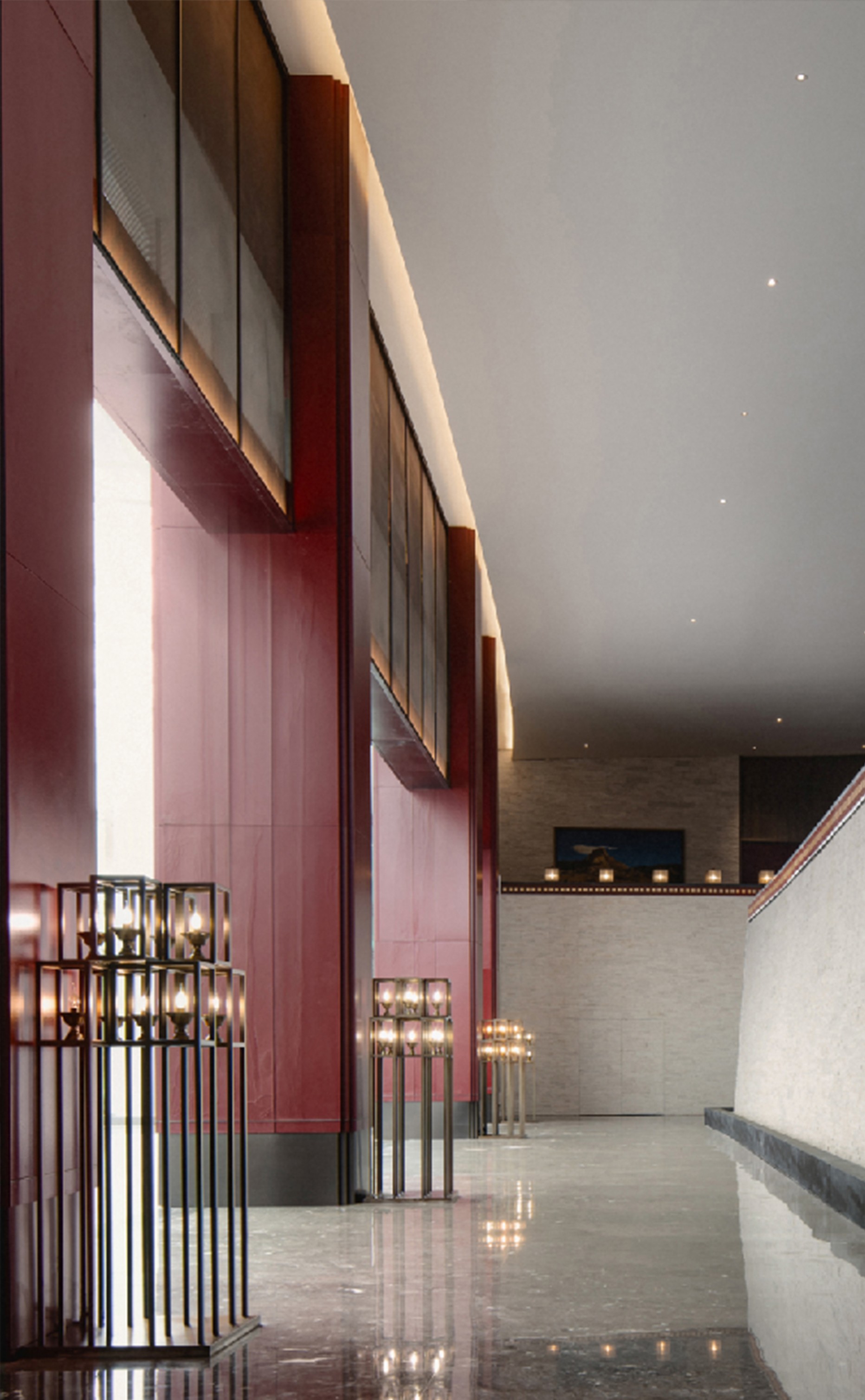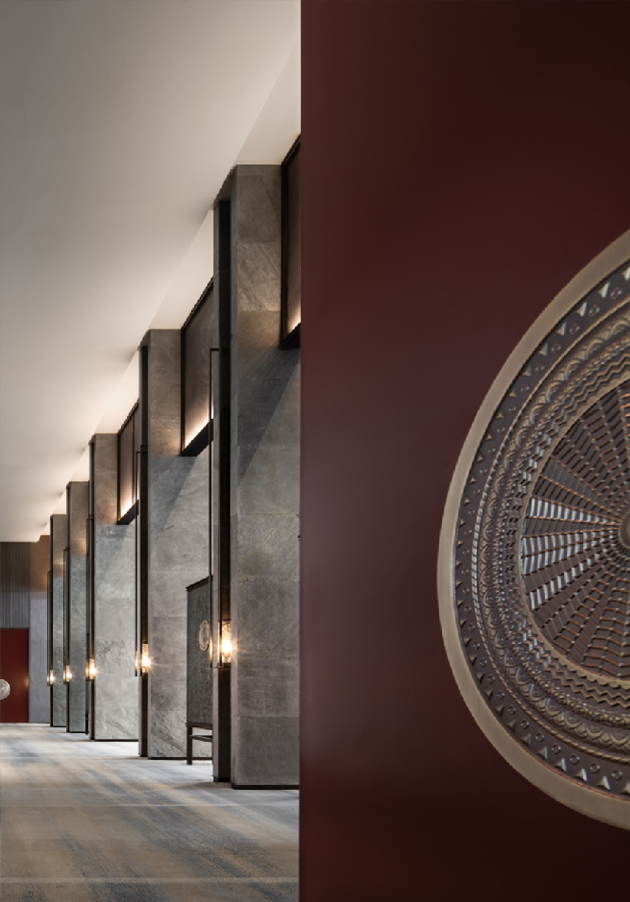 作為酒店改造項目,業主希望以極低的造價控制去保留酒店的歷史風貌同時符合當下的審美,GYD綜合各方面因素,保留藏族色彩印象,對地域元素進行提煉并精細刻畫,立面材料上出于成本控制及震區的考慮,創新的采用了具有的天然質感的薄石材板以及藏式邊瑪墻做法去刻畫一個具有藏式文化氣質的氛圍。