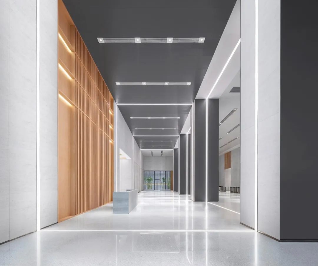 黑與白、縱與橫、冷與暖的強對比手法突破秩序維度,形成的反差給人提供直觀感受和聯想根據,生出夸張的視覺效果和強烈的感染力,增加空間的層次與趣味性。線性的光切進空間,是為亮點,用光束的線性感描述空間結構,以空間表達光的形狀,將光與新古典建筑相融合。