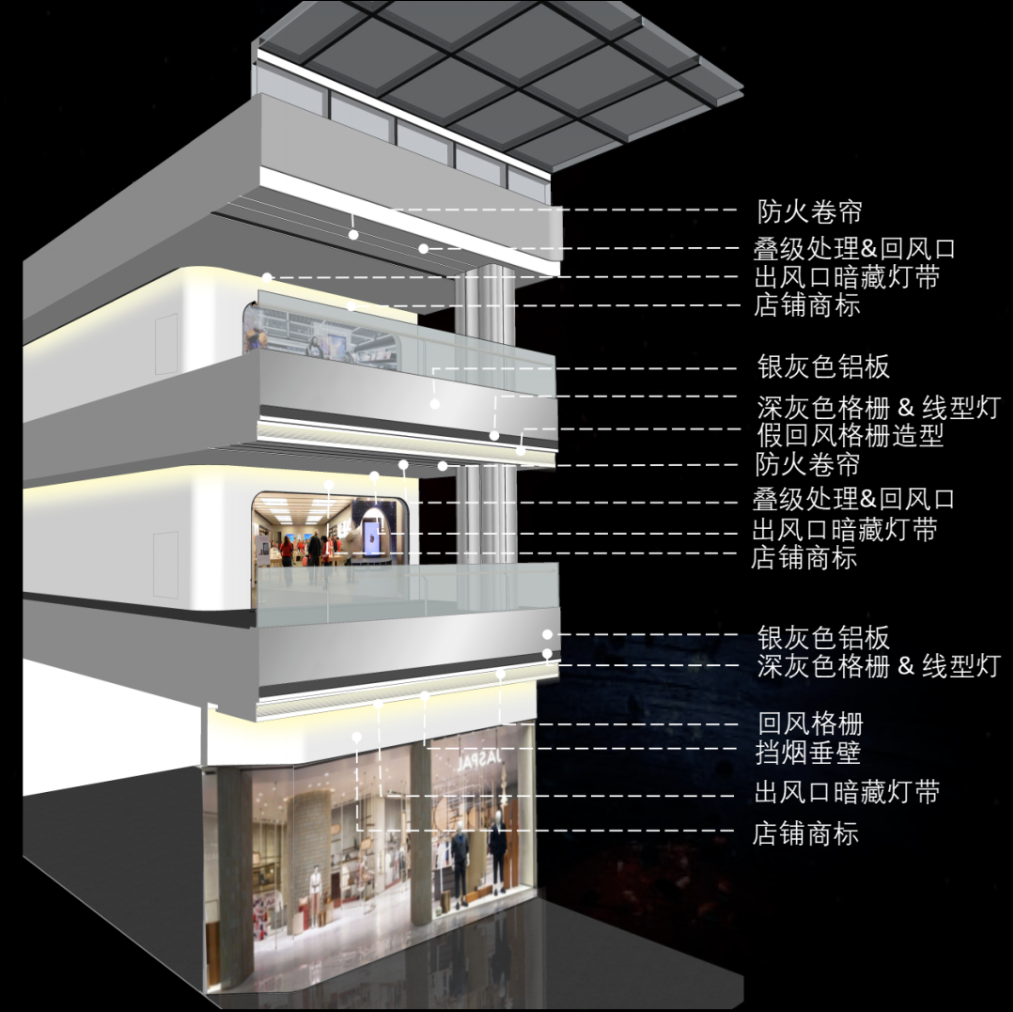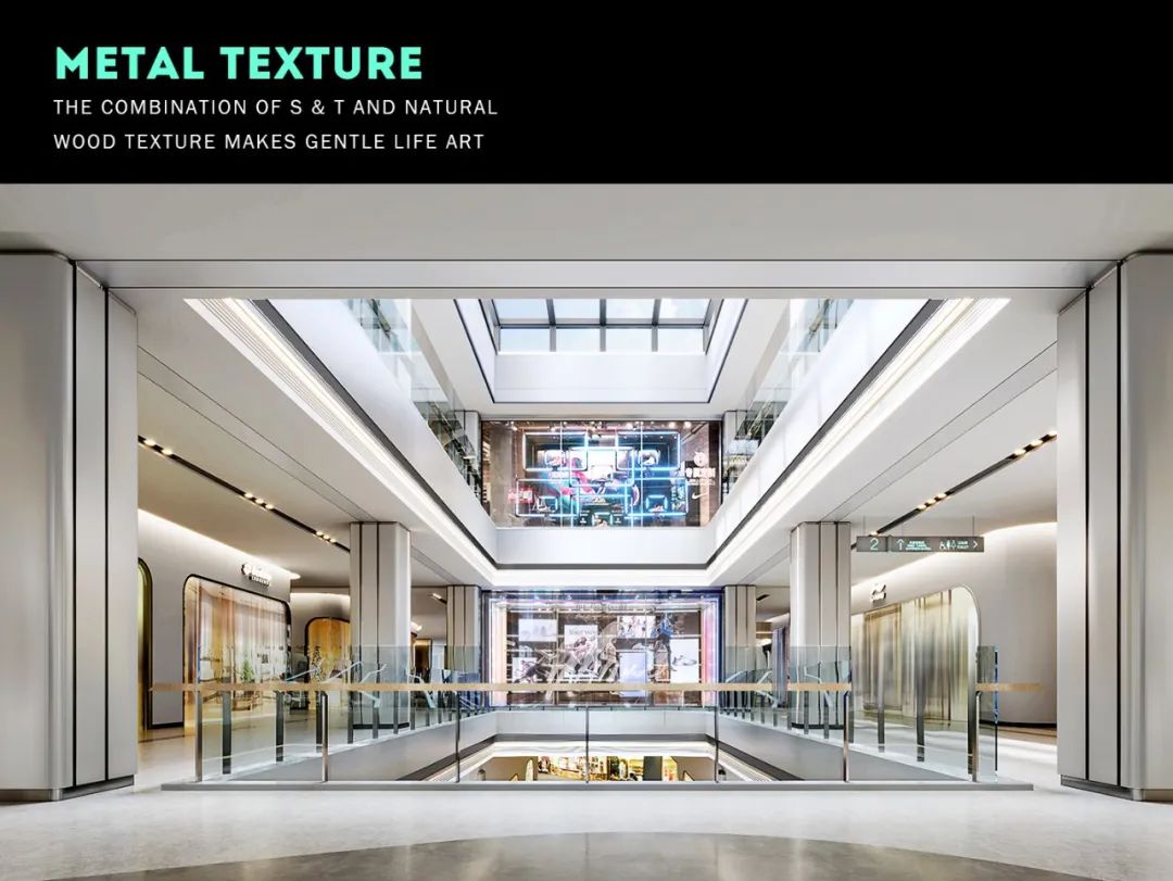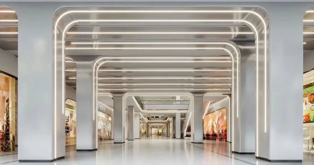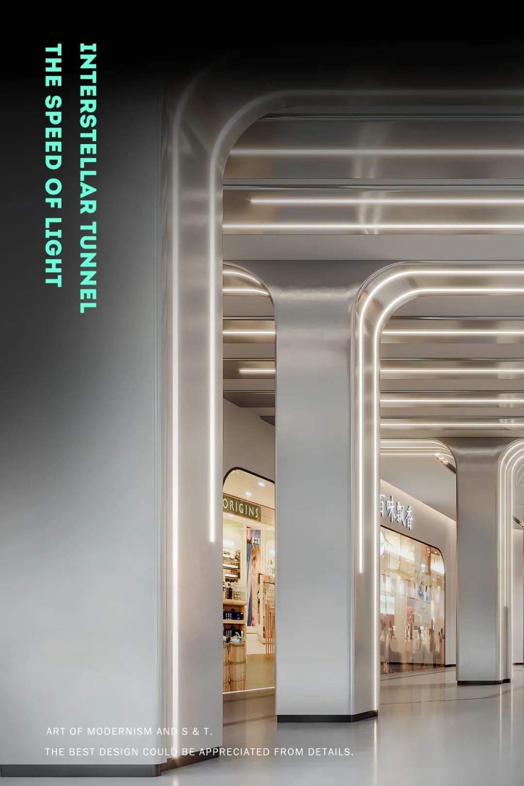 通過金屬材質的反射質感和LED線性燈條打造成富含感科技入口,從這里進入商場有一種登入未來太空飛船的體驗感。