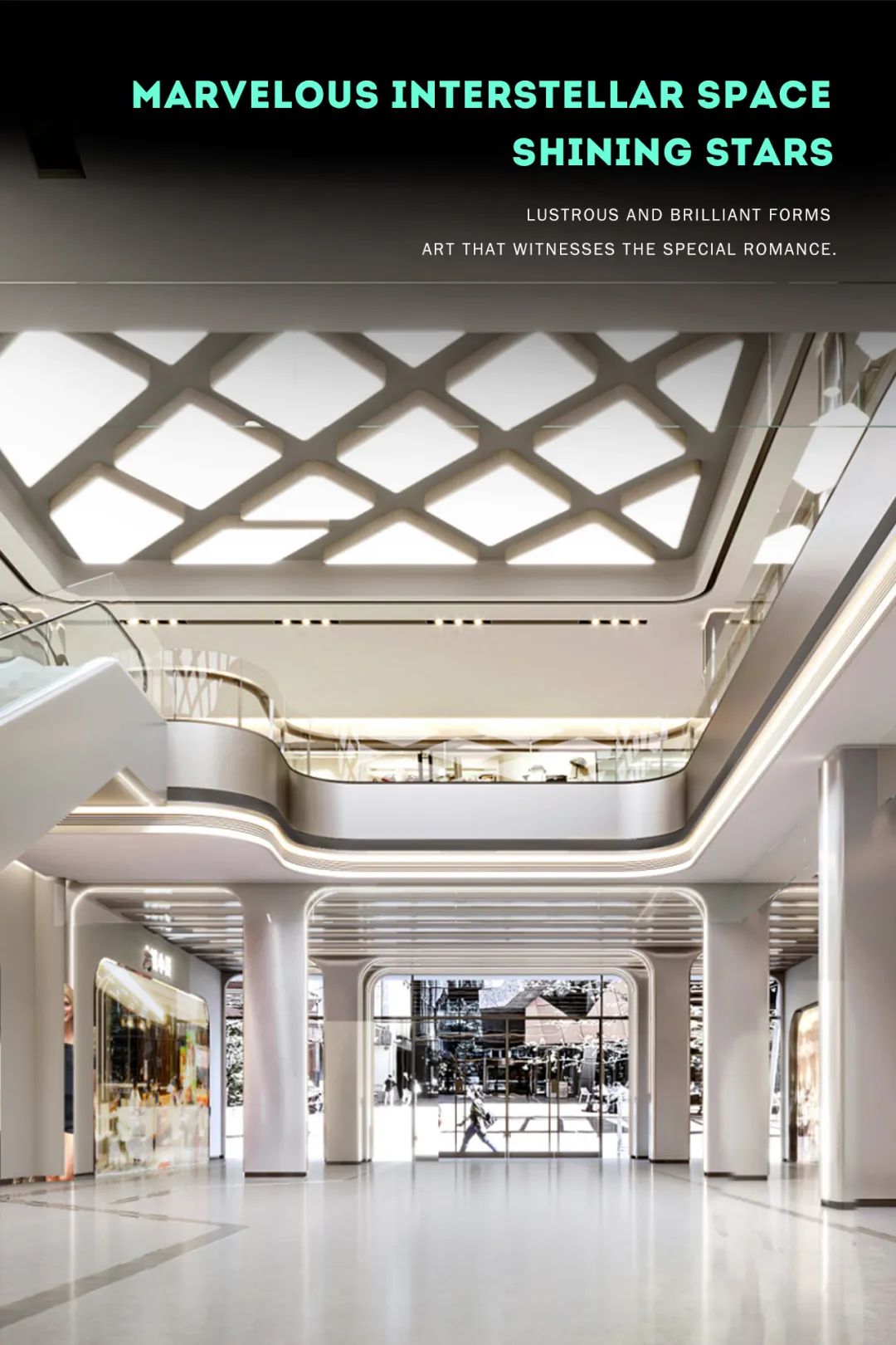 首層運用星球地表作為東入口的設計元素,三層天花中心一個富有科技感的金三角異形造型來突顯主題,配合宇宙星環燈光來整體打造空間,中心點的商業美陳裝飾來豐富空間氛圍。