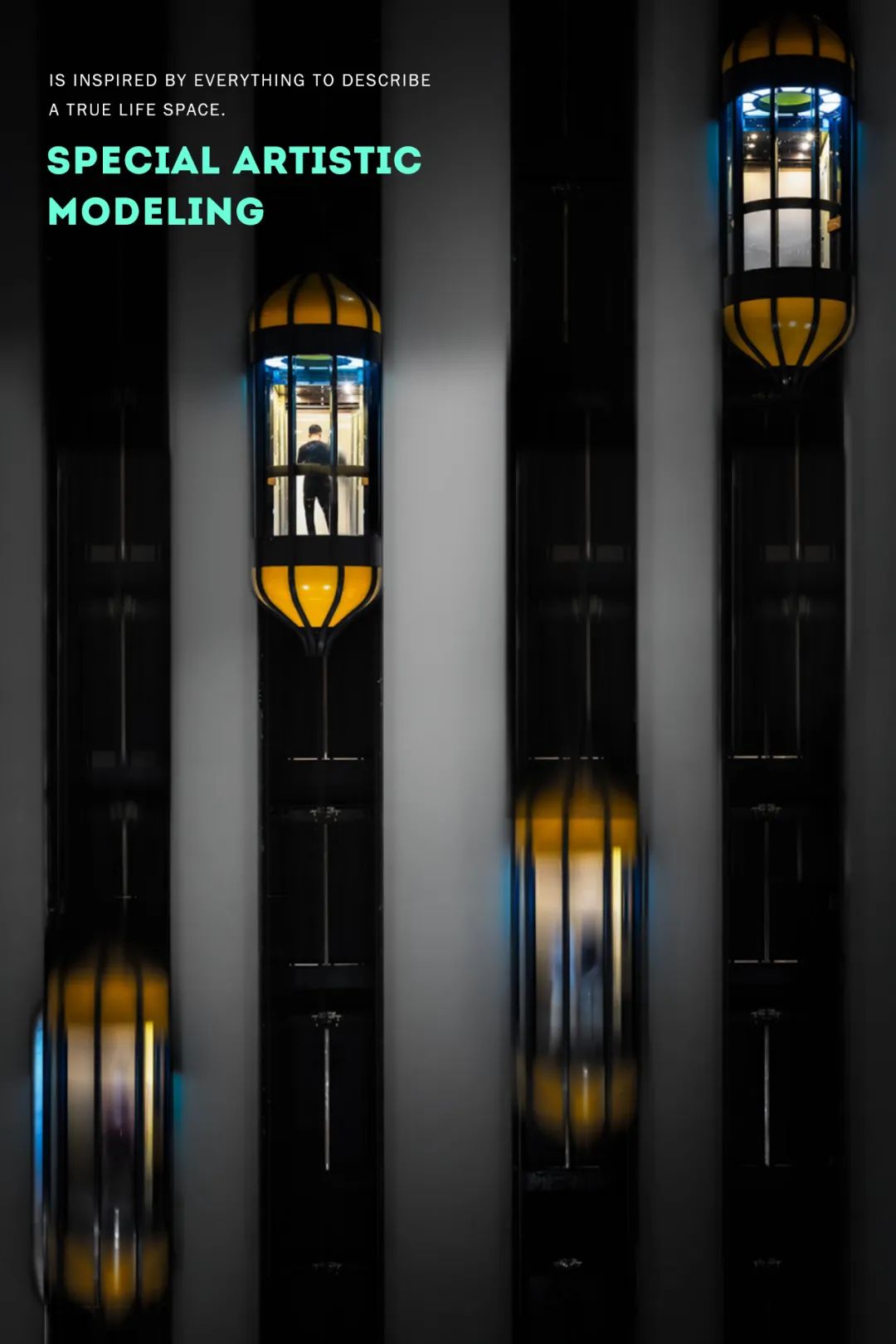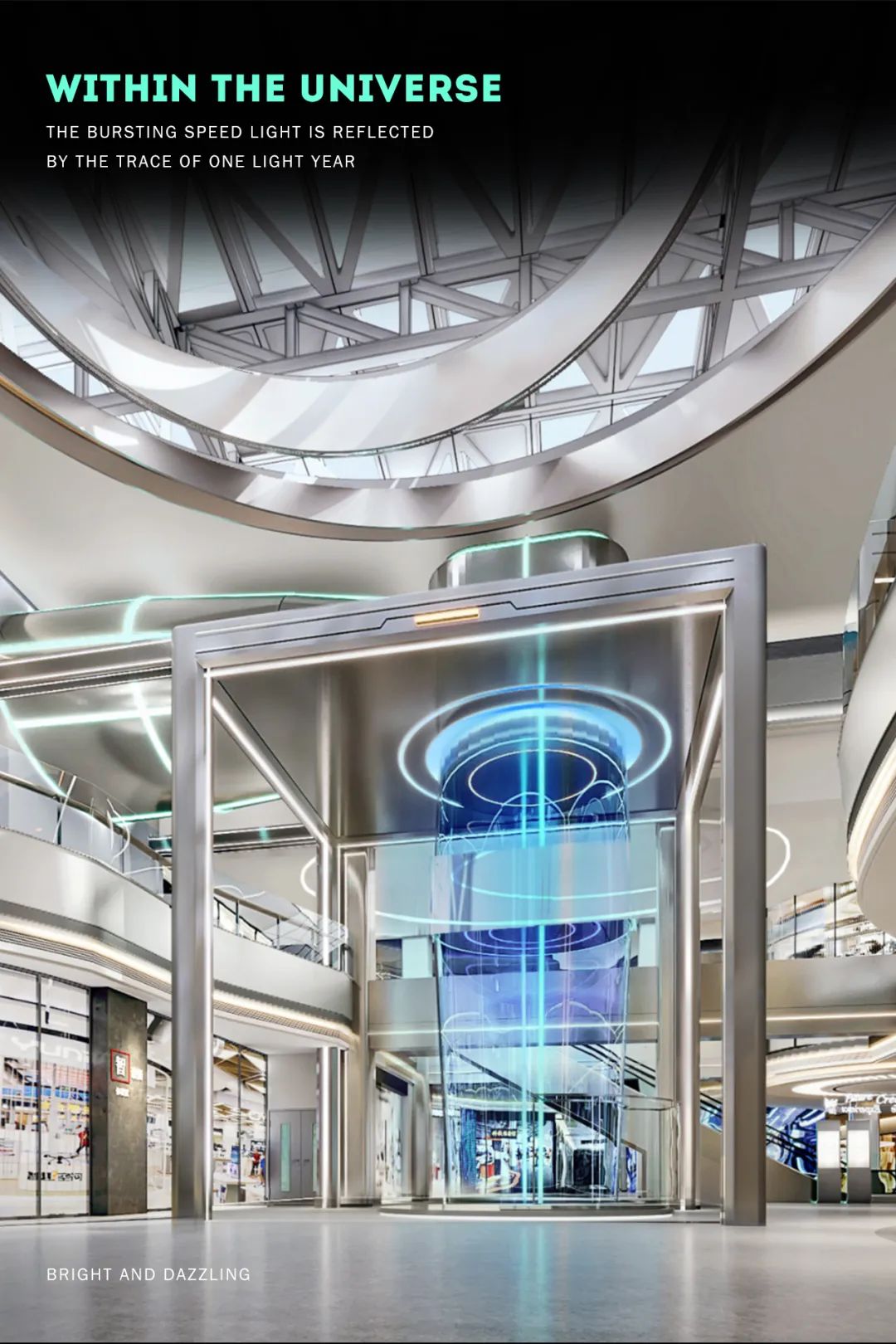 每層標識位置加入LED星光燈,韻律般的閃爍如同宇宙繁星,出每一層電梯都感覺到達了不同的星系。穿越星云到達前沿外星城市,體驗外太空游樂購物之旅。