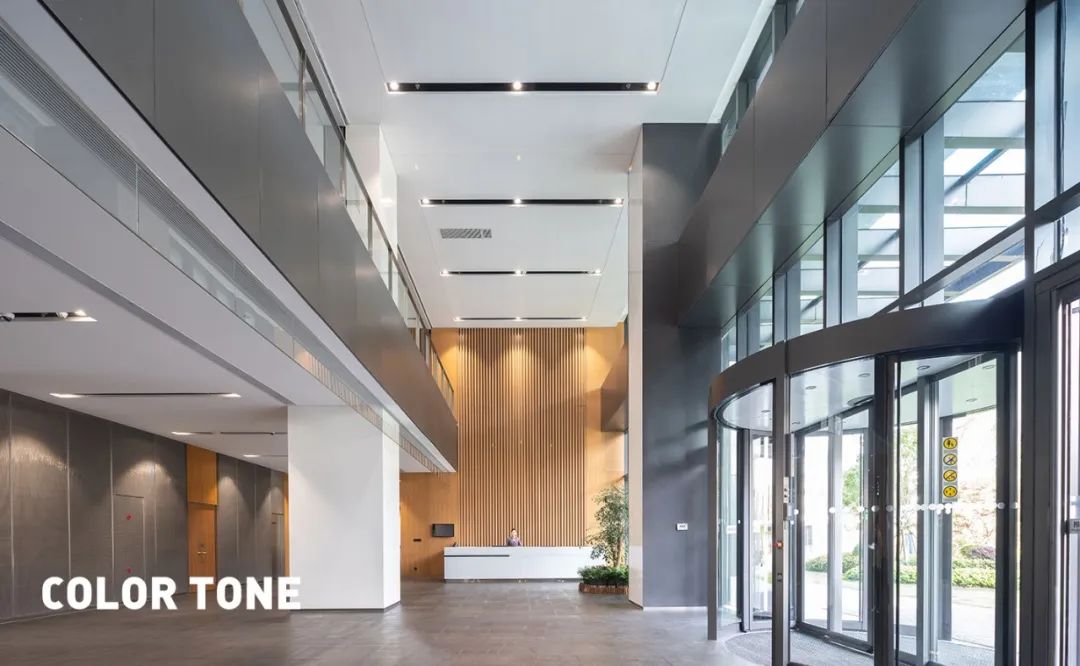 再次,在色彩的應用上,以淺色系與建筑主體色調相結合,共同構成室內色彩基調,并重點體現企業的文化背景和企業精神。