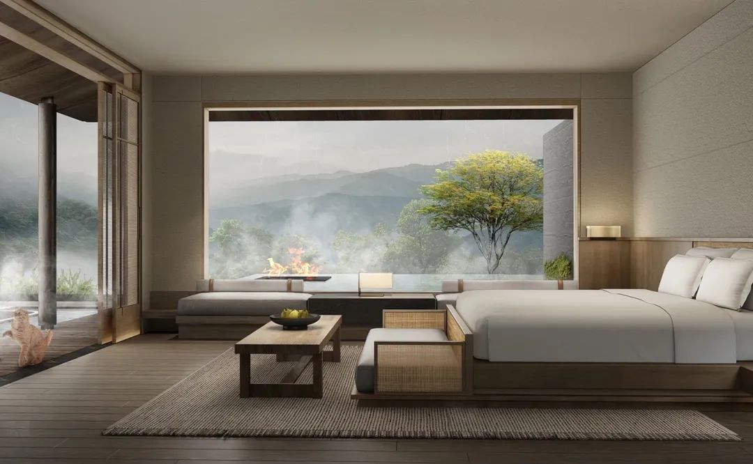 項目設計定位圍繞青城山——五糧液——森林——康養——度假酒店幾個核心關鍵詞展開。項目設計倡導“康、養、道、和”為生活方式,即將身體療愈,自然調養,禪茶悟道,酒品人生為出發點,于酒店處設計東方美學,東方意境的隱士生活情趣。以簡馭繁,融合在地性與自然共生,利用當代設計手法展現古典人文情懷。
