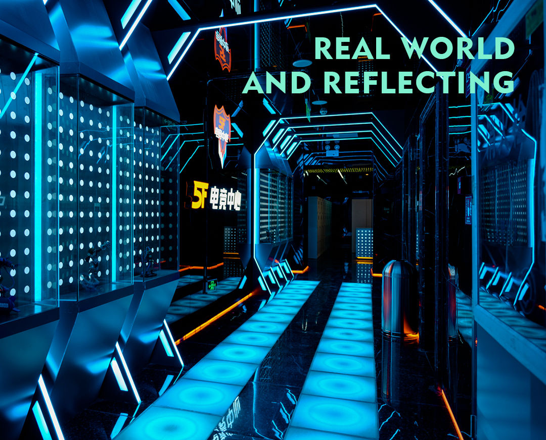 The application of mirror, light reflection and extension effect and a ring aisle finally create a large and closed time tunnel. Such a special design way enables people traveling through there to experience a virtual world and the special charm of electronic sports.