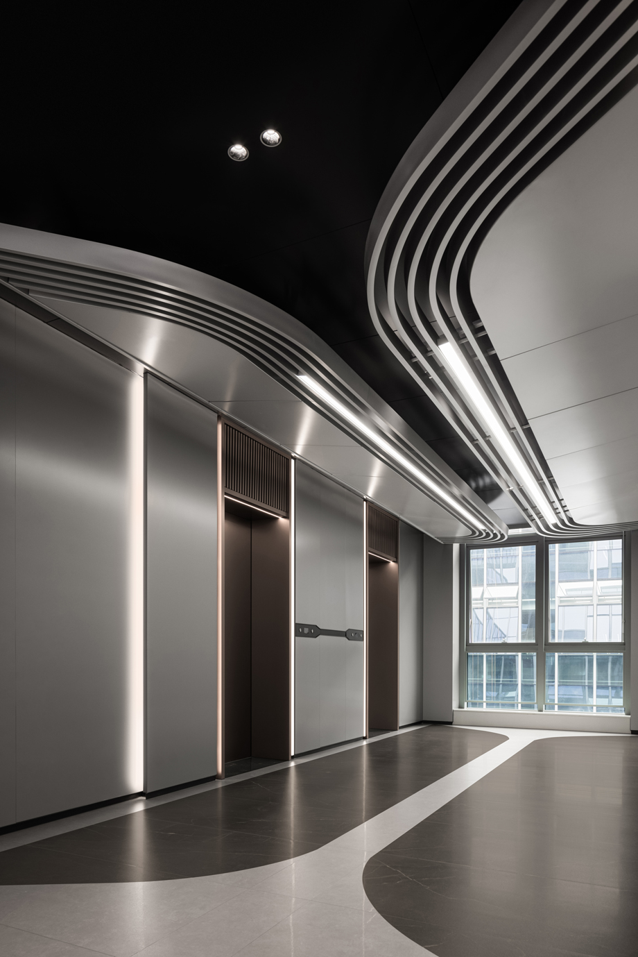 The design of the elevator hall incorporates the concept of track elements and axis symmetry, continuing the coherence and depth of the design. The ceiling design is centered around grandeur and simplicity, with a strong overall sense, reducing unnecessary decorative elements, emphasizing the purity and order of the space, and creating a visual effect that is both open and exquisite.