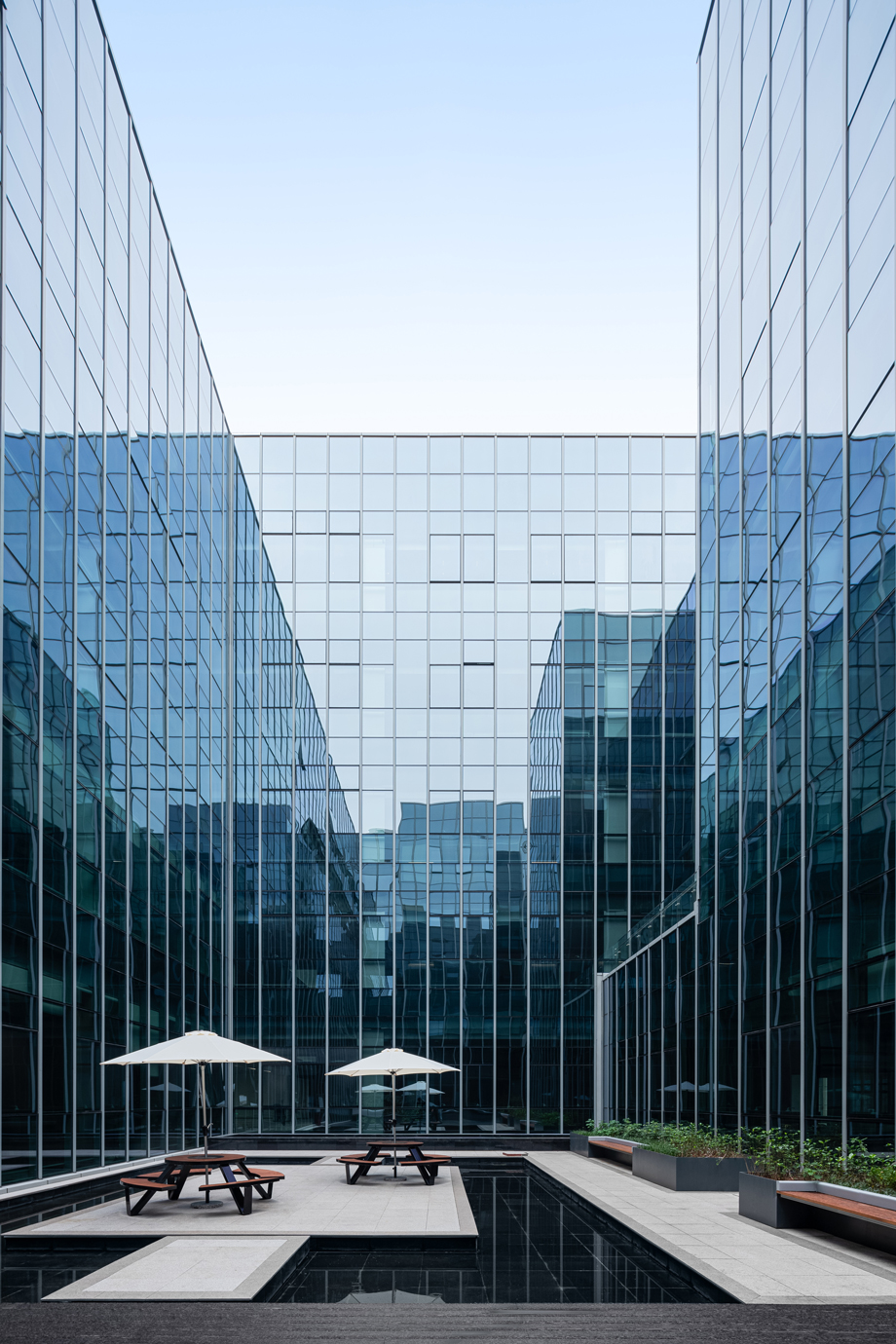The resting area on the third floor, sitting opposite to the elevator hall and tightly combined with the atrium on the third floor, could be integrated with the indoor space seamlessly by the atrium landscape, which implies the concept of integrated design. It adopts the symmetrical design in line with the corporate culture as well, making the whole space more magnificent and more ritualistic.