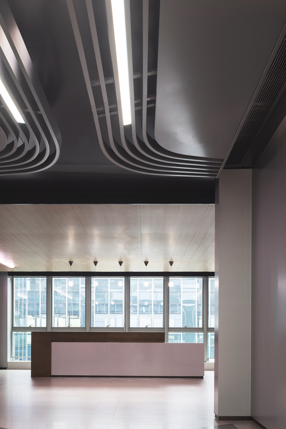 The holistic strategy of lobby spatial design is understood from three dimensions: linear mass; multi-layered streamline; spatial order. Firstly, the functional relationship is clear in the interactions and streamlines among advisory area, resting area, and coffee area.The global spatial framework is formed by a streamlined ceiling. The combination of metal gratings with magnetic tracks is meant to reflect CRRC’s corporate vision centered on rail transit equipment and simultaneously to give the space a clearer and more recognizable feeling of rhythms.