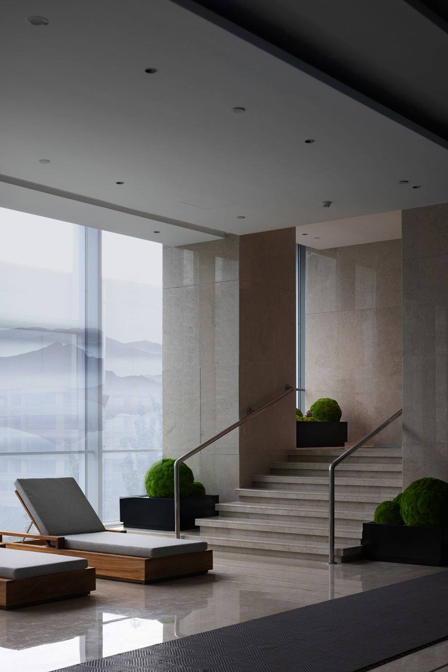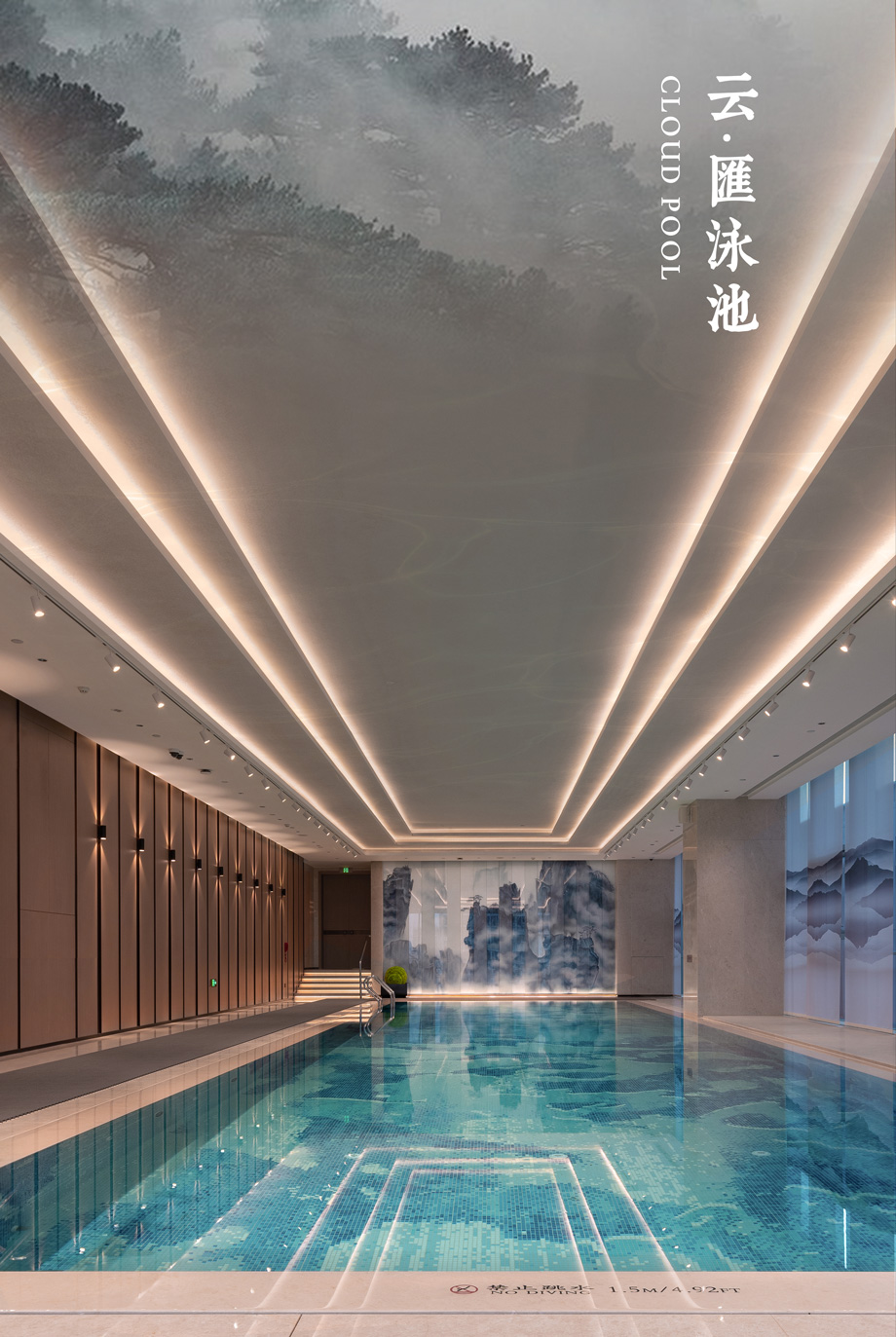 泳池空間,把山林中的青綠色引入到整個泳池的墻面部分,形成一些光影藝術墻。將疊紗的感覺在豎體上體現出來,山林云霧,宛如置身其中。使整個泳池空間有山林秘境之感。