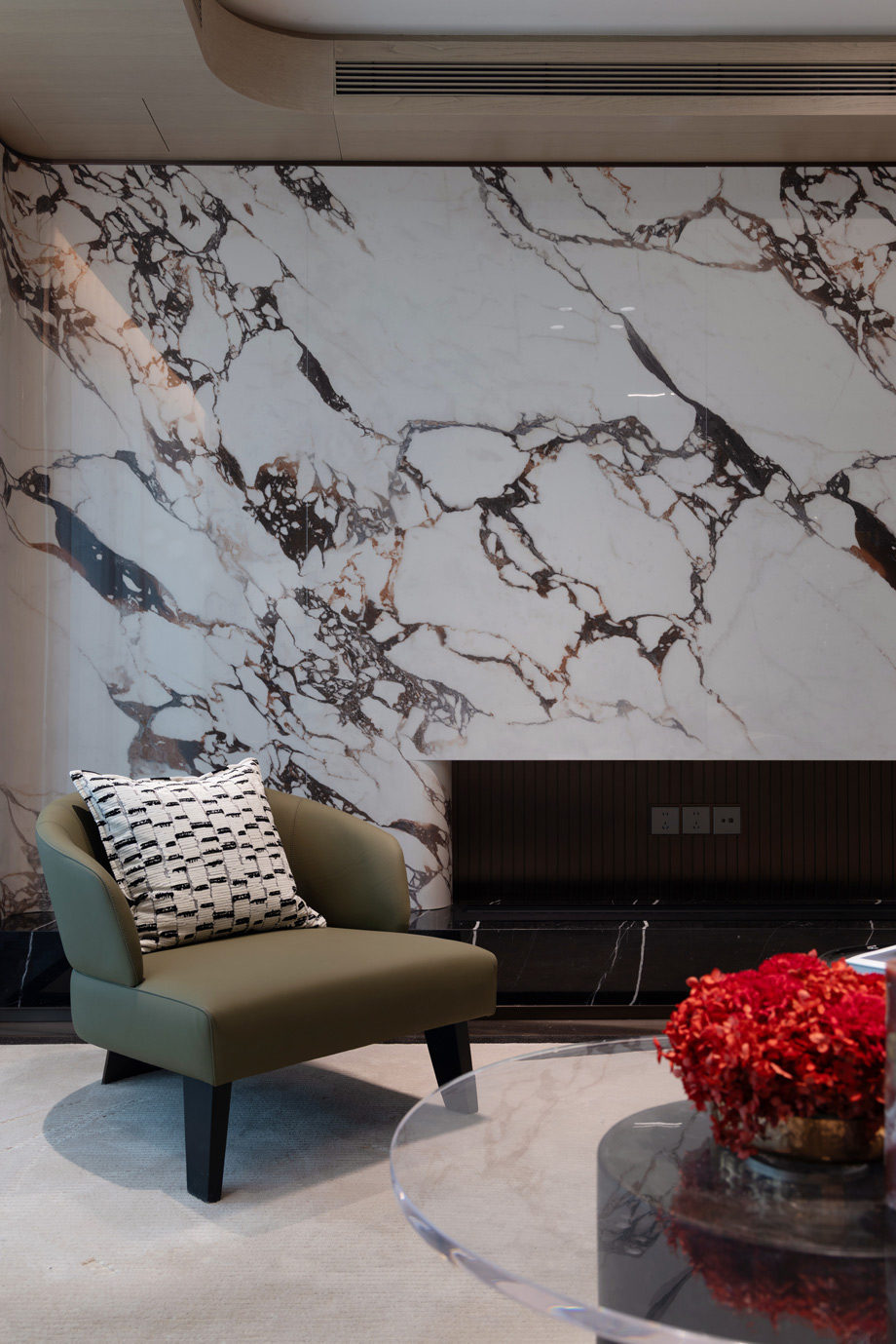 LDK一體化設(shè)計(jì)打破界限,范特西石材通鋪地面如流動(dòng)的琴鍵,串聯(lián)起西廚島臺(tái)的煙雨江南奢石、客廳壁爐的暖意,與餐桌上的琉璃器皿。