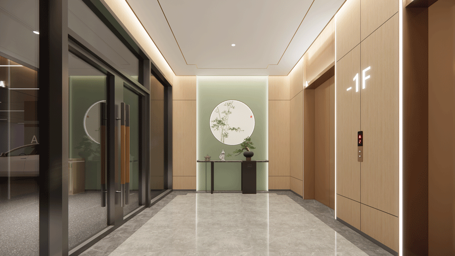地下一層客梯廳、方便老人及家屬通過客梯到達一層或居住樓層。對客用電梯設計時應考慮使用對象大多為老年人,兼顧水平和垂直形式和尺寸,進行適老化細部設計。