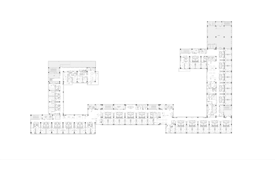 從平面布局圖上可以看出,居室都以單人間的模式一字排開,在公共走道與建筑體量的轉接處安排了醫療護理區域與公共活動區域。截取居住體量的一段可以發現,走廊的端頭位置都是供居住單元內的老人平日活動的區域。