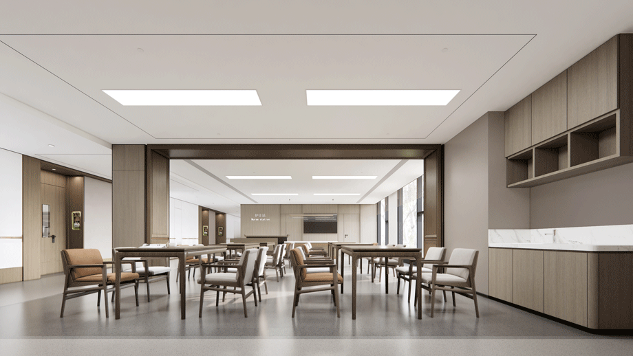 此區域緊鄰醫療部分,一方面作為護理區的等候區域、另一方面也作為護士站的監護視野區。這是第一個視線通道,來自醫護與居室外部公共活動區域的聯系。