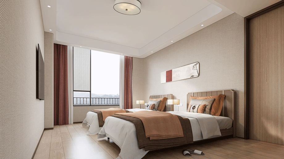 走廊地面鋪設800mm×800mm的防滑地磚,為坐輪椅的老人提供方便。過道兩側距離地面900mm的墻壁上設置扶手,墻面設置一些裝飾畫和注意須知,科普一些必要知識。吊頂下吊200mm,使得視覺上走廊空間擴大,減輕壓抑感。另外,安裝智能化老年公寓環境監測系統,及時感知養老中心環境溫濕度變化,防止意外。