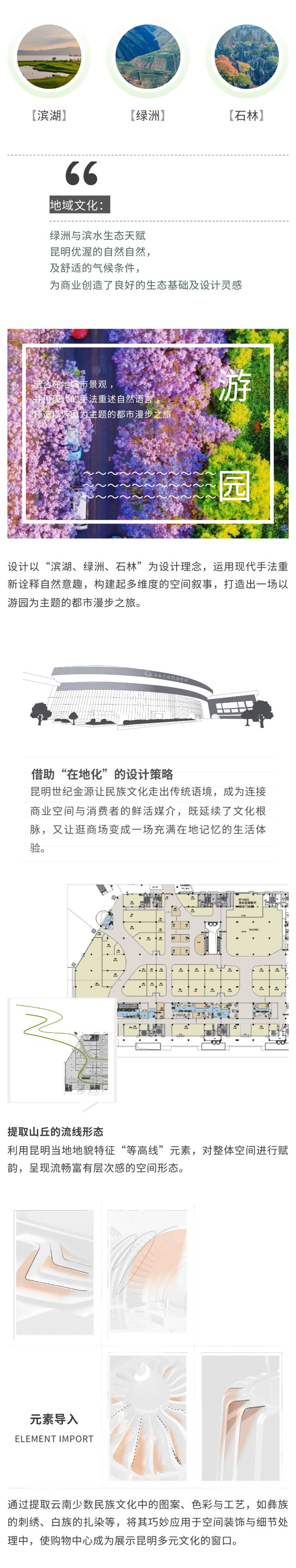 本次昆明世紀金源購物中心一層公區的精裝改造設計,融合了在地人文與自然生態元素,通過現代設計手法重述自然語言,打造出一個既現代又富有文化底蘊的購物環境。