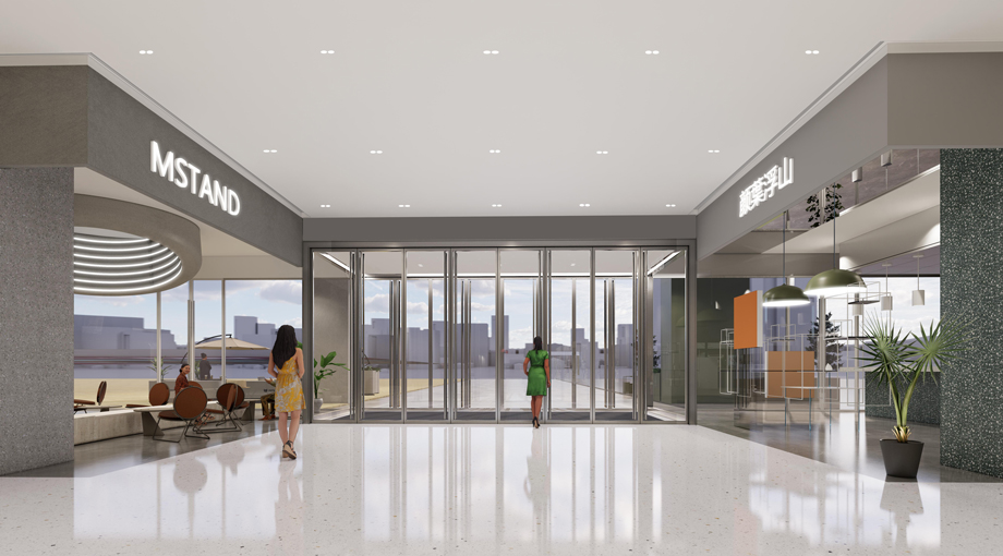 入口區域以“疊境門廊”為設計主題,通過層疊的綠植墻與流線型的門廊造型,模擬山巒起伏的自然景觀,給顧客帶來強烈的視覺沖擊與空間層次感。